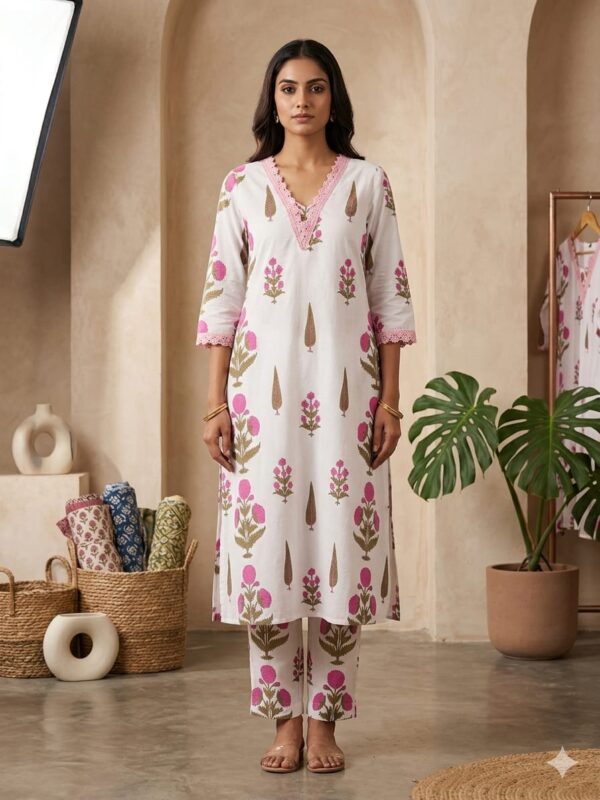 Elegant and graceful, this floral bloom kurthi set is designed to give a soft and stylish look. The white base is a beautifully decorated with pink floral prints, creating a fresh and charming appearance. The Top Offers a Comfortable flare and a flattering fit ,paired with matching pants ,Tis outfit is perfect for casual outings